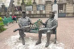 Fidel Castro and Che Guevara first met in June 1955 in Colonia Tabacalera, in Cuauhtémoc, Mexico City, where both agreed to cooperate in the overthrow of Fulgencio Batista, then dictator and president of Cuba.[1] The statue was inaugurated by Ricardo Monreal on 2 December 2017 behind the San Carlos National Museum,[2] a few blocks from where they met.[3] A few weeks later, the bench was removed as it was placed without authorization of the Committee for Monuments and Artistic Works in Public Spaces (Comité de Monumentos y Obras Artísticas en Espacios Públicos, COMAEP).[4] The monument was reinstalled until 17 October 2020.[5]