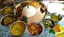 Bengali cuisine is mainly influenced by the diet habits similar to the Hindus and includes a very large variety of sweets and dishes.[114] The Bengali sweets includes desserts made by milk, includes Rasgulla, Sandesh, Cham cham, etc.[115] In Hinduism, the consumption of meat is often avoided in diets due to the Hindu principle of ahimsa which prohibits meat consumption. However, Bengali Hindus adore eating meat of goat, chicken, duck and lamb.[116] Most of the Hindus refrain from eating beef. Meat, especially beef is readily consumed in Bangladesh and where it is considered the meal's main course and the Fish curry (or Machher Jhol) with rice is considered as one of the most staple food by both Hindus and Muslims in Bengal.[117]