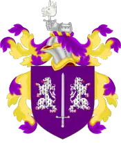 He adopted his father's coat of arms, Purpure a sword palewise proper between two lions rampant addorsed [Argent?].[13] The sword John III and Benjamin displayed was an epee; the only child of Sarah Knowles Bolton, librarian Charles Knowles Bolton, considered that the lions were likely Ermine rather than Argent.[14]