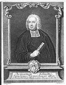 Born in Sonnenburg in Brandenburg, Benjamin Schultze studied at Halle,[3] then was sent in 1719 as a missionary of the Danish mission of Tranquebar. He moved to Madras in 1726 and was supported by the SPCK in London, thus becoming the first member of what came to be known as the English mission.[4] He, along with Peter Maleiappen (1700-1739), worked on the translation of the Bible into Tamil.[5] The Biographical Dictionary of Christian Missions records that he completed Ziegenbelg's translation of the Bible into Tamil (first printed in 1728) and continued with a New Testament in Telugu. He also first translated part of Genesis into the southern form of Hindi or Hindustani (Dakkhini), which was printed at Halle in Arabic characters in 1745, followed by Psalms, Gospels, and Epistles.[1]