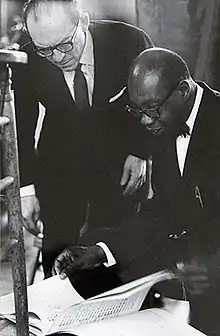 Sponsors included Samuel Barber, Leonard Bernstein, Ruby Dee, Langston Hughes, William Warfield, Aaron Copland, Duke Ellington, and Zero Mostel.[5] As the orchestra developed, Marian Anderson and Leontyne Price joined the Board of Directors, and James DePriest became Principal Guest Conductor.[5] Another prominent guest conductor was Everett Lee.[7]