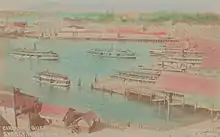 During the construction of Circular Quay in 1837–1844, the eastern side of the cove was used as a quarry and housed construction works. After the governor's residence was moved up the hill to the present Government House, in the 1840s and 1850s Macquarie Street was extended north through the Governor's Domain to Fort Macquarie. This led to the development of the area between the street and the shore into a commercial working wharf dominated by the wool trade, while the eastern side of the street remained part of the Domain. This part of Macquarie Street became known as the "wool store" end.[3] Wool and bond stores and warehouses appeared on the site. The historic "Moore Stairs" was built in 1868 as a passage between two wool stores, leading from the shore to Macquarie Street.[4]