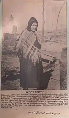 The photo we have is of Peggy walking around the town of Windsor after the Great Fire of 1897 from a newspaper article. It is said that her story has reached many, and when people seen it in Boston they were amazed and started chanting “Peggy! Peggy! Peggy!”[3]