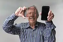 ![]() Bent Stumpe showing a prototype of a capacitive touchscreen developed at CERN in the 1970’s.[1]—a similar technology to which was applied to the iPhone produced by Apple Inc. many years later.[2] | |