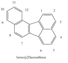 Benzo[j]fluoranthene (BjF) is an organic compound with the chemical formula C20H12. Classified as a polycyclic aromatic hydrocarbon (PAH), it is a colourless solid that is poorly soluble in most solvents. Impure samples can appear off white. Closely related isomeric compounds include benzo[a]fluoranthene (BaF), bendo[b]fluoranthene (BbF), benzo[e]fluoranthene (BeF), and benzo[k]fluoranthene (BkF). BjF is present in fossil fuels and is released during incomplete combustion of organic matter. It has been traced in the smoke of cigarettes, exhaust from gasoline engines, emissions from the combustion of various types of coal and emissions from oil heating,[1] as well as an impurity in some oils such as soybean oil.[2]