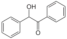Benzoin (/ˈbɛnzoʊ.ɪn/ or /-ɔɪn/) is an organic compound with the formula PhCH(OH)C(O)Ph. It is a hydroxy ketone attached to two phenyl groups. It appears as off-white crystals, with a light camphor-like odor. Benzoin is synthesized from benzaldehyde in the benzoin condensation. It is chiral and it exists as a pair of enantiomers: (R)-benzoin and (S)-benzoin.