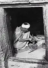 While sedentary life had flourished since prehistorical times, survival in the drier regions, and especially in the High Atlas and Anti-Atlas mountains, was only possible if people moved with their cattle to the higher mountain regions, where grass, herbs and above all water were still available in sufficient quantity. As they did not return to their villages until late autumn, their winter harvests were stored in a fortified communal granary, called agadir, and protected against other nomads and hostile neighbouring villages by guards, who stayed there at all times. In villages and small towns of Morocco, people often lived in traditional buildings called ksour (pl.).[7] In most settlements, blacksmiths and silversmiths operated small, family-run workshops.[8] Based on their skills of handling the four elements: fire, air, water and metals, originally taken from the earth, these professions were often not highly regarded, which was partly due to superstitious beliefs attributed to these skills.[9]