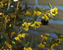 Berberis julianae, the wintergreen barberry or Chinese barberry, is a flowering evergreen shrub native to Central China (Guangxi, Guizhou, Hubei, Hunan, and Sichuan).[3][4] It is widely grown as an ornamental in other temperate regions. It is reportedly naturalized in scattered parts of the United States (Mississippi, Alabama, North Carolina and New York State).[5]