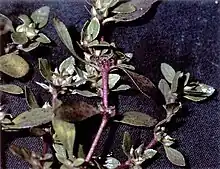 Bergia texana is a species of flowering plant in the waterwort family known by the common name Texas bergia. It is native to the western and central United States and northern Mexico, where it is a plant of wetlands, living in mud and moist soils along the edges of rivers and pools. This is an annual or perennial herb producing a branching, glandular, hairy stem which grows upright or trailing up to 30 centimeters long. The leaves are 2 to 4 centimeters long, mainly oval in shape and pointed, and lightly toothed along the edges. The inflorescences appear at the tips of stem branches and in the leaf axils, bearing single flowers or small clusters. Each small flower has five green sepals and five greenish white petals. Some of the flowers open, while others are cleistogamous, remaining closed and self-pollinating. The fruit is an oval capsule with many seeds in each of its five chambers.