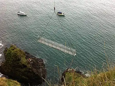 The Gobbins Path was an extremely successful tourist attraction, as popular as the Giants Causeway, and Wise planned to continue it over a full-length of 3+14  miles to a northern exit at Heddle's Port. An extension was opened in 1906, but then Wise fell ill. In August 1906 Bowman Malcolm reported to the Board that the full scheme would be too expensive, so he was authorised to proceed only to the 'Seven Sisters Caves' and to postpone any further work. After Wise left the company this final extension was opened in 1908, with a spectacular suspension bridge spanning the mouths of the Seven Sisters.[5] The railings and bridges were last painted in 1936 and The Gobbins Path was closed in 1940 during World War II. It was re-opened in 1951 by the Ulster Transport Authority (UTA), with admission of 1 shilling for adults and 6d for children. A number of the bridges were strengthened by the UTA, but the path was affected by landslips and maintenance problems which forced its closure in 1961.[2]