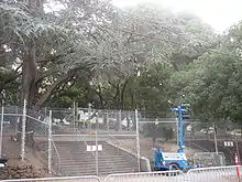 On August 29, 2007, a chain link fence was constructed around the protesters.[1] The fence was erected to prevent confrontation between the protesters and the sellout crowd of 72,516 people (17,000 of them from Tennessee, the opposing team) that were expected to attend the opening game of the California Golden Bears' football season.[1] Protesters responded with shouts and promises to make it difficult for the UCPD to guard the fence.[1] The protesters claimed the fence was erected not to protect them, but to starve them out.[1] Some have drawn comparisons between the building of the fence, and the attempted take back of People's Park in 1969, in which the California National Guard was called in to remove protesters.[28] Initially the police did not allow food and water to be passed over the fence to the tree sitters, but started to allow the deliveries by the evening.[1][2] Two men were arrested following scuffles with police.[2] Around 200 additional people joined hands around the fence in support of the tree sitters.[1] The fence cost the University between $10,000 and $12,000 to build.[1] Despite the fence more protesters took up spots in the trees.[2]