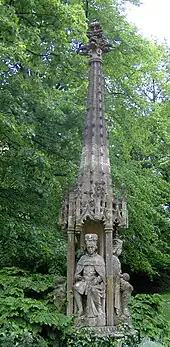The statue in the gardens is a replica of the Bristol High Cross which was erected in the city in 1373 honouring various British monarchs, and moved to College Green in 1733. The statue was given in 1768 to Stourhead gardens and can be seen there today.[4] The current statue is a replica which was originally sited on College Green was made by John Norton in 1851 and removed in the late 1940s. The Bristol Civic Society purchased the remains in 1950 and re-erected the truncated remains seen today in Berkeley Square.[5][6][7]