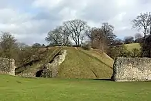 The castle was located slightly away from the main road, to give additional space for the earthworks involved, and was positioned as to benefit from natural springs running down from under the hill.[1] It had a motte and bailey design, with a 40 foot (12 m) high motte, and a bailey around 500 foot (150 m) by 300 foot (91 m), enclosing 0.6 acres (0.24 ha) acres. A double bank and ditch ran around the whole castle, with both sets of ditches filled with water.[5] In total, the wider earthworks occupy around 11 acres (4.5 ha).[6] A fossarius – a specialised ditch digger – was recorded as being employed maintained at the castle in 1086.[7] Radiocarbon dating of organic remains from within the castle's motte indicates a post 1066 construction date.[8][9]