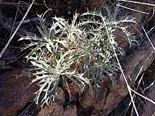 A perennial herb or subshrub up to c. 1.5 m. tall. Stems branched, whitish araneose-tomentose, or glabrescent, leafy. Leaves sessile, 3–6 cm. long, dentate to pinnatifid-dentate; lamina (excluding the teeth or lobes) 2–3(4) mm. wide and linear or 5–15 mm. wide and lanceolate; teeth 3–8 on each side, each tooth 2–6(10) mm. long, triangular or linear and extended in a tawny spine 2–3 mm. long; margins of teeth and sinuses entire or armed with smaller spines; upper surface smooth or somewhat scabrous, slightly to densely araneose-tomentose or glabrescent; lower surface whitish felted-tomentose. Capitula radiate, solitary and terminal on the branches, or subcorymbosely arranged, 2.5–5(+?) cm. in diam. including the rays. Phyllaries spreading, felted-tomentose outside, subglabrous or glabrous inside, 10–20 x 1–3 mm., linear-lanceolate, spiny-acuminate, ciliate-spinescent on the margins with spines 1–3 mm. long; the outermost phyllaries ± leaf-like with small spine-tipped teeth; inner phyllaries smaller and less spinescent-ciliate. Margins of the receptacular alveolae extended into straw-coloured bristles 1–2 mm. long. Achenes 1.5–3.5 mm. long, turbinate, 8–10-ribbed, strigose-sericeous, glandular-viscid at the apex. Pappus scales 2-seriate, 1–1.5 mm. long, narrowly oblong, acute or subobtuse, denticulate towards the apex.