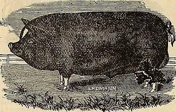 The Berkshire is a traditional breed of the county of the same name. Until the eighteenth century it was a large tawny-coloured pig with lop ears, often with darker patches.[5]:551[6] In the late eighteenth and early nineteenth centuries it was substantially modified by cross-breeding with small black pigs imported from Asia.[5]:558