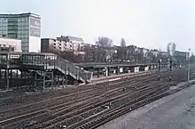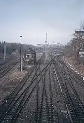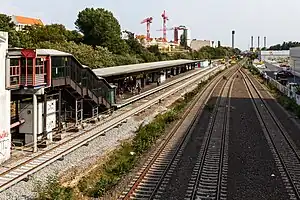 After the temporary closure, the station area increasingly fell into disrepair. The entrance building and the glazed transition was used as a showroom for a car dealership from 1985, but the former was demolished in 1993.[3] In the years that followed, numerous discussions arose about reopening the line. Among the various suggestions as to how the railway systems should be restored, there was also the option of "capping" the S-Bahn route including the parallel urban motorway, i.e. converting the entire route into a tunnel. The area above would have had space for 1,400-1,600 apartments. However, the lack of private investors meant that the project was put on hold.