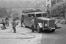 In 1901 the International Fire Protection Exhibition took place in Berlin to mark the 50th anniversary of the professional fire brigade.[7] In 1906 at the fire station in Berlin-Grunewald, the first gasoline fire truck in Germany equipped with a fire pump was put into service.[8] In 1908 Berlin purchased its first electric fire engine. [9][10] During the First World War from 1914 to 1918, seven hundred officers had to transfer from the Berlin Fire Brigade to the Wehrmacht, where part of the firefighters were deployed in the newly created flamethrower regiments.[11]