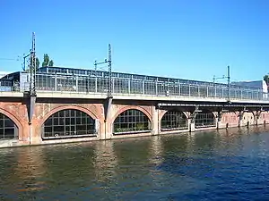 The Stadtbahn line is an elevated rail line with viaducts totaling 8 kilometers (5.0 mi) in length and including 731 masonry viaduct arches. A further 2 kilometers (1.2 mi) of the line is situated on 64 bridges, that cross adjoining streets and (three times) the River Spree. The remaining length of the line is on an embankment.