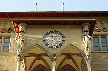 The current building was begun in 1406–07 by Heinrich von Gengenbach on the site of a townhouse owned by the Burgistein family.[6] Von Gengenbach died shortly after construction began. The name of his replacement was not recorded.[7] It was completed around 1415 to 1417. Between 1430 and 1450 the grand external staircase was built and two chambers for the great and small councils were added to the upper story. Between 1526 and 1540 the cantonal council building was added near the hall. Beginning in the 16th century other government entities moved into the building including the cantonal archives, the treasury, the mint and the cantonal printing office.