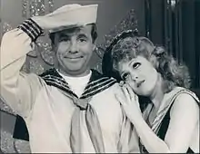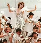 Peters's performance as "Ruby" in the 1968 Off-Broadway production of Dames at Sea, a parody of 1930s musicals, brought her critical acclaim and her first Drama Desk Award.[10] She had appeared in an earlier 1966 version of Dames at Sea at the Off-Off-Broadway performance club Caffe Cino.[17][18][19] Peters had starring roles in her next Broadway vehicles—Gelsomina in the 1969 musical version of the Italian film of the same name, La Strada (for which she won good reviews but the show closed after one performance) and Hildy in a revival of On the Town (1971), for which she received her first Tony Award nomination. She played Mabel Normand in Mack and Mabel (1974), receiving another Tony nomination. Clive Barnes wrote: "With the splashy Mack & Mabel ... diminutive and contralto Bernadette Peters found herself as a major Broadway star."[20] The Mack and Mabel cast album became popular among musical theatre fans.[10] She moved to Los Angeles in the early 1970s to concentrate on television and film work.