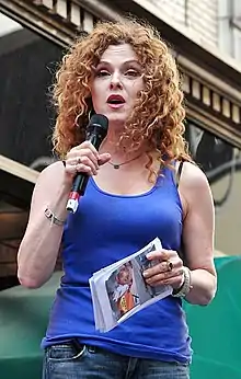 Peters's next stage appearance was in the role of Sally Durant Plummer in the Kennedy Center for the Performing Arts production of the Sondheim–Goldman musical Follies in 2011.[65] One critic wrote: "Peters ... exquisitely captures the character's unfathomable sadness and longing. It's a star turn, for sure, but one that brings attention to itself because of its truthfulness. Not surprisingly, her rendition of 'Losing My Mind' is simply shattering."[66] She reprised the role in the Broadway revival at the Marquis Theatre, later in 2011,[67] and received a nomination for the Drama Desk Award, Outstanding Actress in a Musical.[68] At the 66th Tony Awards in 2012, Peters was presented with the honorary Isabelle Stevenson Award for "making a substantial contribution of volunteered time and effort on behalf of one or more humanitarian, social service or charitable organizations, regardless of whether such organizations relate to the theatre", specifically for her work with Broadway Barks.[69] In making the announcement for this award, the Tony official site noted "With a rich generosity of spirit, Bernadette Peters' devotion to charitable causes is perhaps only outweighed by her much fêted dedication to performing. ... Peters' efforts are held in the highest regard on Broadway and beyond." BC/EFA's Tom Viola said, "Bernadette's boundless compassion and generosity represent the best in all of us."[70]