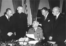 - ↑ Harry S. Truman Library and Museum, Daily Appointment Sheet, Tuesday, October 10, 1950. http://www.trumanlibrary.org/calendar/main.php?currYear=1950&currMonth=10&currDay=10 Also pictured (left to right) H. E. The Most Reverend William R. Arnold, representing Cardinal Spellman, Frank L. Weil, Chairman, the President's Committee on Religion and Welfare in the Armed Forces, and Rt. Rev. Charles W. Flint, representing Bishop Stamm, President of Federal Council of the Churches of Christ in America.