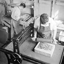 Bernarda Bryson was born in Athens, Ohio, where her father owned the Athens Morning Journal and her mother was a Latin professor.[2] Both of her parents were politically active and liberal.[2] Her maternal grandfather was also politically active, with his home a stop on the underground railroad.[3] In Ohio, she studied art, including etching, and art history at several schools including Ohio University, Ohio State University, and the Cleveland School of Art, and learned lithography from a friend.[2] She married young, divorced, and then worked for a newspaper in Columbus, the Ohio State Journal, writing about art news, and teaching printmaking for the museum school at the Columbus Museum of Art.[1][2] On a trip to New York in 1932 (or 1933)[1] to interview Diego Rivera, during the production of his Rockefeller Center murals, she met his assistant Ben Shahn.[4] After moving to New York shortly after completing the interview, Bryson reconnected with Shahn and they moved to Washington, DC.[2] Bryson and Shahn had three children together and eventually settled in Roosevelt, New Jersey.[1] She died at her home in Roosevelt at the age of 101 on December 12, 2004.[1]