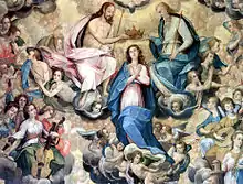 Coronation of the Virgin in St. Peter's Church is centered on the Trinity, below which Mary is found.[2] Presentation is typically Mannerist in elongated limbs and elegant poses, with mostly soft blue and pink colors. There is experimentation with the colors, which change in shadows and folds of drapery.[14] Floating in the clouds are angels and cherubs,[2] with considerable variation in postures, with figura serpentinata all over. The painting, however, differs from typical Mannerism in one important regard. It is markedly symmetrical and focused. As such, it emphasizes the Trinity in accordance with the didactic mission of the Jesuits and in the spirit of the Counter-Reformation.[14] Bitti painted the persons of the Trinity as clearly distinct: God the Father and Son are of different ages, and the Holy Spirit takes the form of a dove. This was to avoid potential confusion that could arise in the eyes of natives when looking at paintings that portray the Trinity as a three-faced man or three near-identical men.[15]