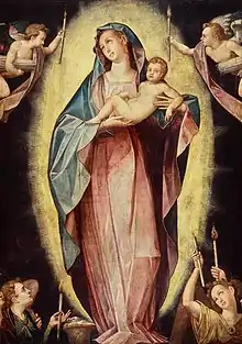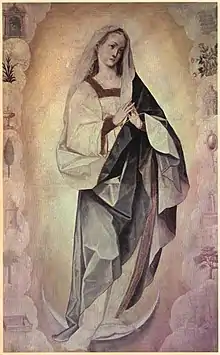 Immaculate Conception, an altarpiece in the Basilica of La Merced in Cusco, is typical of Bitti. Mary, with sharp features, is set against a background that does not reveal a setting.[1] In the painting, made for devotion, she is at the same time accessible to the devotee and exists in an otherworldly realm.[16] The colors are cool and pastel, and drapery folds in the typical brittle fashion. The painting relies on visual exaggeration reminiscent of the work of Italian Mannerists like Bronzino and Parmigianino, but without any eroticism.[1]