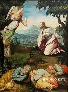 Agony in the Garden, painted c. 1600 and now in the Lima Art Museum, has an elongated and graceful Christ figure and an angel, both in pastel draperies that seem to ignore both gravity and the shape of their bodies.[17]