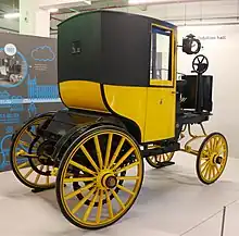 The first cabs were constructed by the Great Horseless Carriage Company, with bodies made by the coachbuilder Mulliner and designed to resemble a traditional horse-drawn coupé cab.[4][1] Internal and external electric lighting was provided.[6] The vehicle's four wheels were clad with solid rubber tyres that were intended to provide grip on London's greasy pavements.[1][5] A later version of the cab with larger capacity batteries was built by the Gloucester Railway Waggon Company. A total of 77 cabs of both types were constructed.[4] Bersey said the advantages of his invention were that "there is no smell, no noise, no heat, no vibration, no possible danger, and it has been found that vehicles built on this company's system do not frighten passing horses".[5]