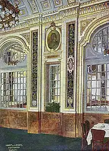 In 1889 the Kempinski restaurant at Leipziger Straße 25 was opened, the largest business of its kind in Berlin. Wilhelm II selected the mayolica tiles from his Cadiner Majolika manufactury and attended the opening of the Kaisersaal (Emperor's hall). Kempinski later specialised on wine trading and devolved the management to his son in law and his nephew.[1]