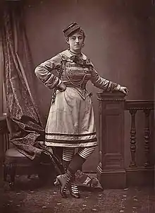 The Evening Telegraph of Philadelphia, Pennsylvania on 17 November 1868 noted with approval in its review of The Lancashire Lass that "Miss Bessie Sudlow, who sustains the part of 'Fanny Danville' at the Chesnut, no longer affects a 'Grecian bend'."[10] The "British Blondes" performed at the Tammany Grand Theatre in 1868–1869.[4] Bessie performed in January 1869 in New York in the burlesque The Page's Revel.[11] A lovely young woman at the age of 20, in 1869 Bessie was included in the cast of The Forty Thieves at Niblo's.[9] In April and May 1869 she appeared in Robinson Crusoe and His Man Friday!.[11] A review in The New York Times of 27 April 1869 listed Bessie among the singers. It was lukewarm, saying the pantomime-burlesque was "wrought out of tolerably old material ... [it] will be witnessed with greater pleasure when repeated rehearsals shall have smoothened it."[12]