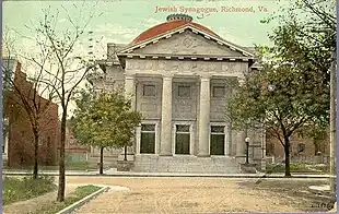 On March 4, 1904 the congregation laid the cornerstone for its present building, known as the Franklin Street Synagogue. The building was dedicated on December 9, 1904.[1] The domed, Neoclassical synagogue was designed by the Richmond-based firm of Noland and Baskervill (now Baskervill), who also designed nearby St. James' Church and the wings of the Virginia State Capitol. The synagogue has 29 stained glass windows. Most notable is a window on the building's eastern wall created and signed by the Louis Comfort Tiffany Studios in 1923. It depicts Mt. Sinai.