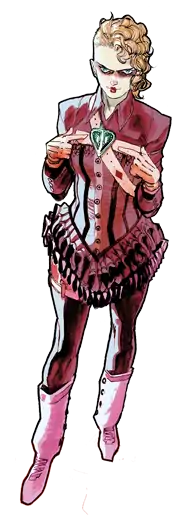 Alice makes her first appearance in 2009 in Detective Comics #854. With the death of Bruno Mannheim, the supervillain group known as the Religion of Crime is leaderless. The thirteen covens that make up the Religion of Crime elect Alice to lead the group, giving her the title "High Madame".[7] Beth is shown to be insane,[17] as she dresses in clothes and makeup to resemble the character Alice from Lewis Carroll's novels and only speaks in quotations from the Alice novels.[14][lower-alpha 4] She kills a number of members of her own group when they fail her or question her abilities.[14][8]
