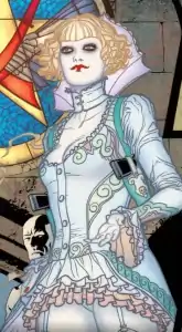 Alice is 24 years of age when she makes her first appearance. She suffers from a psychosis in which she presents a personality based on the fictional Lewis Carroll character, Alice, and speaks in quotations from Alice novels and stories. She is depicted as having chalk-white skin, short and wavy blonde hair, red nails and lips, and using heavy black mascara and eye-liner. She dresses in white, pseudo-Victorian fashion with a low décolletage and dress cut away in front to expose her thigh-high stockings and garter. The Alice personality's speech balloons are black with white borders. The text is also white, as well as serif transitional, partly italicized, and in upper and lower case. This indicates her psychosis. The Beth personality's speech balloons are white with black, sans-serif, all-caps text. This is the same style used by all other characters in the comic, which represents her lucidity.[14] Alice is usually armed with one or more handguns, sometimes carries sharp-edged weapons such as razor blades and knives, and has an acquired immunity to many poisons and chemical weapons.[14] She has extensive knowledge of a wide range of chemicals, drugs, hallucinogens, and poisons.[32]