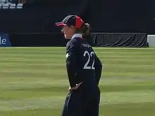 Morgan played seven test matches, 72 one day internationals and 28 T20Is for England.[1] She was a member of England's victorious team in the 2009 World Twenty20 competition, and scored a vital unbeaten 46 from 34 balls in the defeat of Australia in the semi-final.[4] She made her maiden test fifty against Australia in the one-off Ashes test the same year, scoring 58 in almost six hours at the crease.[5] Due to a shoulder injury, she retired from international cricket on 15 January 2013.[6]