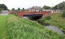 The drain crosses Swine Moor, and then turns to the south-east, to pass under Beverley Beck.[28] The structure is variously described as a bridge, aqueduct or tunnel, and is constructed in red brick with ashlar dressings, having three segmental arches. It has been a Grade II Listed structure since 2001.[29] At Woodmansey, the 60-mile (97 km) Wilberforce Way long-distance footpath, created in 2007, briefly follows first the west bank and then the east.[30] In the final section, the drain is separated from the river first by nurseries and farms, and then by housing as it passes through the outskirts of Kingston upon Hull.[28] A Grade II Listed bridge carries Lockwood Street over the drain. It dates from the late nineteenth century, and is constructed of wrought iron, with cast iron balustrades.[31] Shortly afterwards, the drain discharges into the River Hull at a sluice.[28]