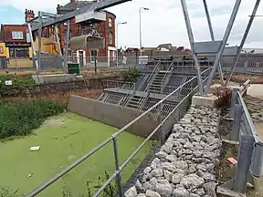 Sculcoates power station was built adjacent to the drain in 1898, at the point where the docks railway line crosses the drain. The station used water from the drain via two sluices for condensing and cooling in the power station.[25]