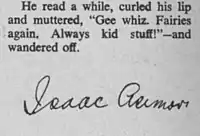 - ↑ Asimov's "Kid Stuff" and Dick's "The King of the Elves" appeared in the September 1953 issue: ""Kid Stuff" & "The King of the Elves"". Beyond Fantasy Fiction. 1 (2): 121, 142. September 1953. Bradbury's "The Watchful Poker Chip" appeared in the March 1954 issue: "The Watchful Poker Chip". Beyond Fantasy Fiction. 1 (5): 128. March 1953.. These and more may be found via an online index: "Issue Grid: Beyond Fantasy Fiction". ISFDB. Retrieved 2017-03-04.