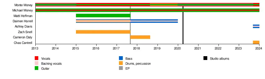 - Monte Money – vocals, guitar (2013–present), drums (2013–2015; 2019–present; studio only), bass (2013–2015; 2019–present; studio only)