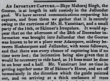 The surveying was completed and he next decided to make way to Adampur.[8] This would prove to be a mistake of the increasingly salient Maharaj Singh.[10] There existed a 10,000 rupee bounty placed against Maharaj Singh, either dead or alive.[2][10][5] This was the largest bounty reward amount for any outlaw of that period by the British.[5] A Muslim informer reported his presence to local authorities.[8] Amardeep Singh believes whoever turned him in probably did so for financial reasons as the reward amount was a hefty sum for that time, enough to transform someone into a rich person.[5] He was arrested at Adampur in a sugarcane field along with 21 of his followers on 28 December 1849 as a result by Henry Vansittart.[2][1][8][3]