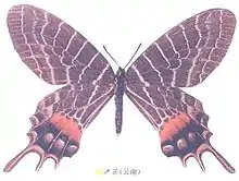 In 1992, Chou claimed that a specimen of B. ludlowi had been collected in Yunnan and had been lodged in a Chinese collection. Although this record was questioned by subsequent authors, a later publication by Chou (2000) did not provide additional information. Although Chou (2000) illustrated a specimen, it was later determined to be a retouched photo of the type specimen in the British Museum (Natural History). As no specimen has demonstrably been collected in China, Bollino and Racheli (2012) argued that the record was a misidentification of Bhutanitis lidderdalii spinosa.