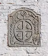 This Brabantine farm dating back to the 12th century and named in sources from 1601 was the property of Florival Abbey in the Belgian town of Archennes (part of the municipality of Grez-Doiceau)[7][8][9] for more than six centuries: the coat of arms of Anne Josèphe de la Croix, abbess from 1733 to 1749, still stands proudly on the farm's corps de logis.[1][2][7][8] In 1991, the four scallop shells, standing for Louvain-la-Neuve, were used for the crest of Ottignies-Louvain-la-Neuve, next to the symbols of the other sub-municipalities of Céroux, Limelette, Ottignies and Mousty.[10] The crest bears in its centre the Saint Benedict Medal, which is an encircled cross, above the Latin expression: "Crux Mihi Dux",[7][8] short for "Crux Sit Mihi Dux" (May the Holy Cross be my guide). The Saint Benedict Medal is embellished by four scallop shells and flanked by two high flowering plants.