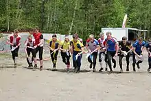 Relay teams consist of two or three athletes. Every athlete perform the running part in the same way as a sprint, except that the course is longer and that up to three extra rounds can be used in the shooting part. The penalty loop should correspond to 90 seconds for the best athlete.