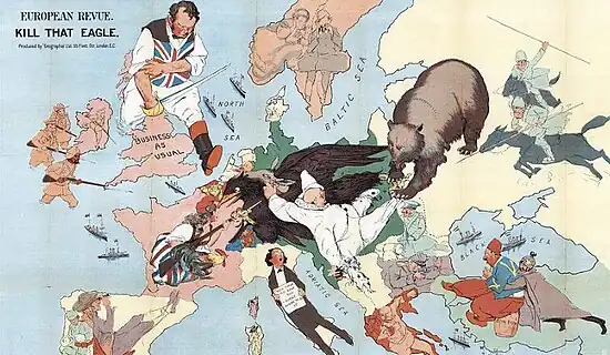 "European Revue. Kill That Eagle" by John Henry Amschewitz, 1914; Germany is the black eagle in the center, surrounded by enemies and bystanders, with only Austria (the clown in white) helping.