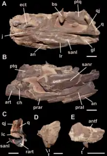 The back of the lower jaws is known. The lower jaw probably has an outer lateral window. The surangulare has a protruding and widened top into which a large sphincter fitted, the Musculus adductor mandibulae externus. The back of the surangulare has a triangular profile, bears a raised protrusion that encloses the rather deep lower temporomandibular joint from behind, and protrudes moderately far back. The angular has a distinctive elliptical hollow on the underside. The prearticular partially wraps around that underside. The articular is robust, without pneumatization. It has a robust large retroarticular protrusion, the posterior tip of the bottom that is shaped like a spoon and angled upwards. On the inside, the articular has a smaller protrusion with a notch in the top that allowed a nerve, the chorda tympani, to enter the jaw.