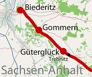 The Biederitz–Trebnitz railway is a double-tracked, standard gauge, electrified railway line in the German state of Saxony-Anhalt timetabled as (KBS) 254 and 256. The line begins in Biederitz near Magdeburg and runs via Güterglück towards Dessau. According to Deutsche Bahn, the line ends at Trebnitz on the former border between the Duchy of Anhalt and Prussia.