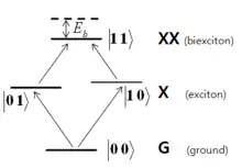 where is the binding energy of the biexciton and is the energy of exciton.[5]