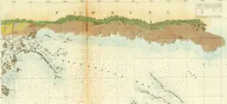 The Big Bend Coast is a drowned karst region, covered with salt marsh and mangrove forests. It includes freshwater springs, oyster reefs, and the delta of the Suwannee River. There are barrier islands west of the Ocklockonee River and south starting with Anclote Key, but there are no barrier islands between those places. The Big Bend Coast has little or no sand or mud. The karst topography has produced an irregular, frequently exposed, bedrock surface.[4][5][6][7] Sediment of Holocene origin is generally limited to salt marshes and the nearshore zone, and is redistributed by tidal action and storm events. The Suwannee River carries about 73,000 metric tons of sediment to the coast each year.[8] The Big Bend Coast is on the Gulf Coastal Lowlands of Florida, which has recently exposed ocean-smoothed terraces with Tertiary limestone at or just below the surface. The flatness of the Big Bend Coast is interrupted by an area of relic sand dunes just inland from the Cedar Keys. The presence of a high water table has produce a karst landscape. The limestone hosts the Florida aquifer, which reaches the surface near the coast. Steady discharge from the aquifer supports the discharge of the many springs feeding rivers and streams along the coast and maintains a high water table near the coast.[9]